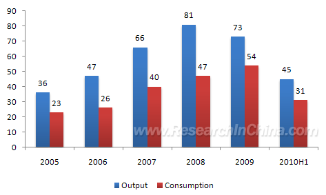 Molybdenum Output and Consumption in China, 2005-2010 (unit: 1,000 tons)  Source: ResearchInChina Chinese