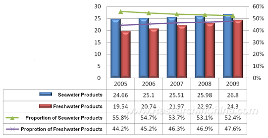 respectively. Outputs of Seawater Products and Freshwater Products in China, 2005-2009 (mln tons)  Source: NBS; ResearchInChina China