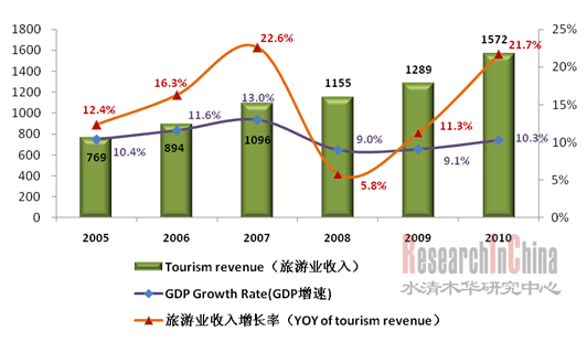 Tourism is an important part of the tertiary industry. China has made clear its intention to build tourism into a strategic pillar industry of the national economy. The development of tourism and the overall trend of economy are generally in the same direction, both with conspicuous economic periodicity. The financial crisis hit tourism heavily in 2009, and the growth rate of tourism declined with decreasing GDP growth rate. However, in 2010, tourism walked out of the crisis in the wake of the rebounding global economy, and China's tourism revenue amounted to RMB1.57 trillion, up 21.7% year on year.