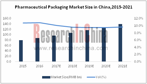 Under the impetus of the fast-growing downstream pharmaceutical industry, Chinese pharmaceutical packaging market size increased year by year at the CAGR of 11.2% during 2010-2016. From 2017 to 2021, the market size will maintain the growth rate of about 10% and is expected to outnumber RMB140 billion in 2021, thanks to severe aging, the released two-child policy, the rapid development of biological agents and supporting policies.